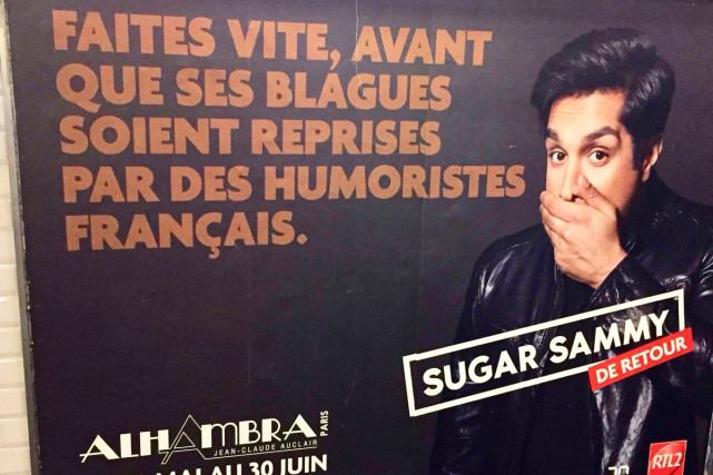 On reconnaît bien là l’humoriste a la langue bien pendue. Après avoir fait un malheur au Québec avec une publicité présentée dans le métro de Montréal (revoyez ici de quoi il était question), Sugar Sammy propose cette fois une campagne publicitaire tout aussi audacieuse dans la capitale française. Après que plusieurs personnes aient dénoncé publiquement les humoristes français qui volaient des blagues à leurs collègues (